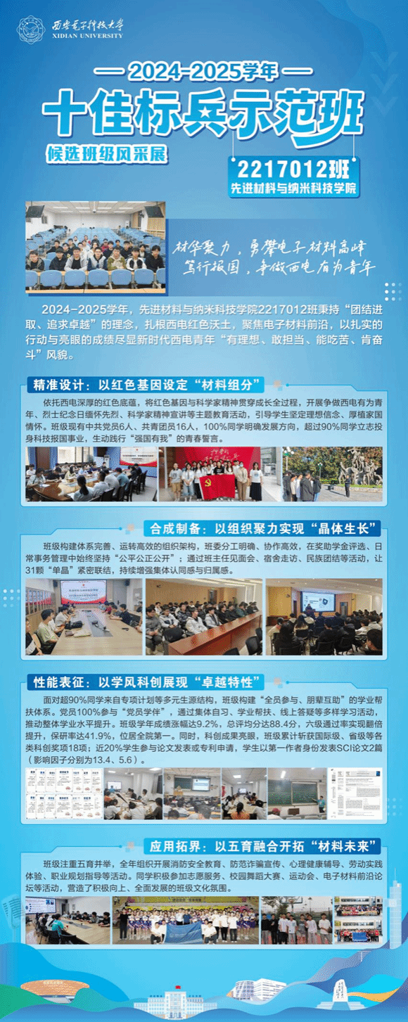 2217012班经班级申报、学院推荐、学校材料复审、辅导员推介、班级代表答辩等多轮严苛角逐,2217012班凭借扎实的班级建设、突出的学风成果与全面的综合素养,成功斩获校级“十佳标兵示范班”荣誉称号,充分展现了新时代西电青年“有理想、敢担当、能吃苦、肯奋斗”风貌。