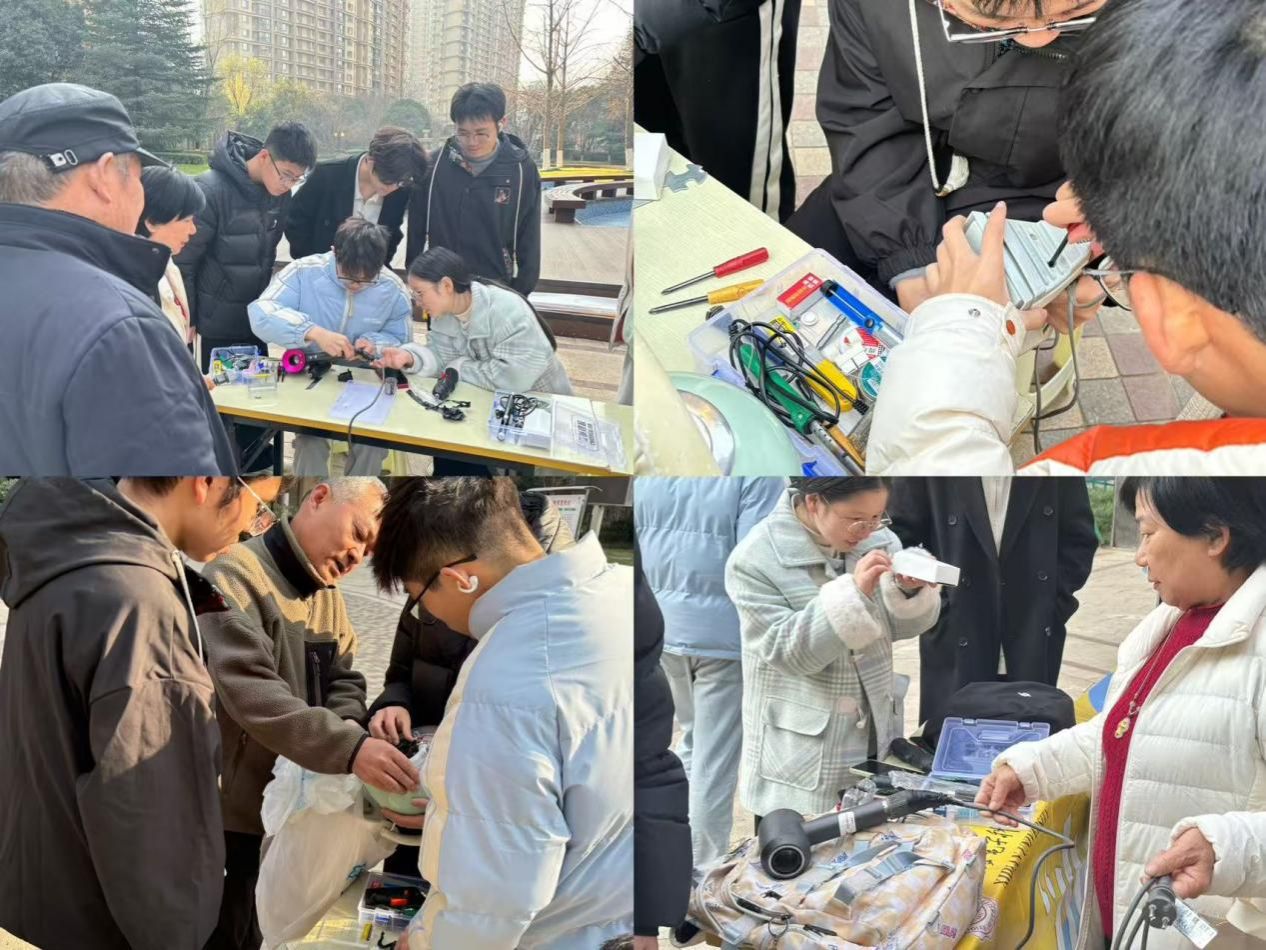 活动伊始,志愿者们迅速搭建起临时维修工作台,有序展开电器检修工作。尽管冬日渐寒,但同学们热情高涨,全身心投入到细致紧张的维修任务中。陆续有居民送来家中出现故障的电器,包括电热水壶、手电筒、电吹风等多种日常用品。志愿者们分工协作,依托专业知识与实践技能,认真排查电路问题、更换损坏零件、逐一测试功能,尽力让每一件旧电器重新恢复使用。针对无法现场修复的电器,志愿者们也提供了专业的故障诊断与维修建议。