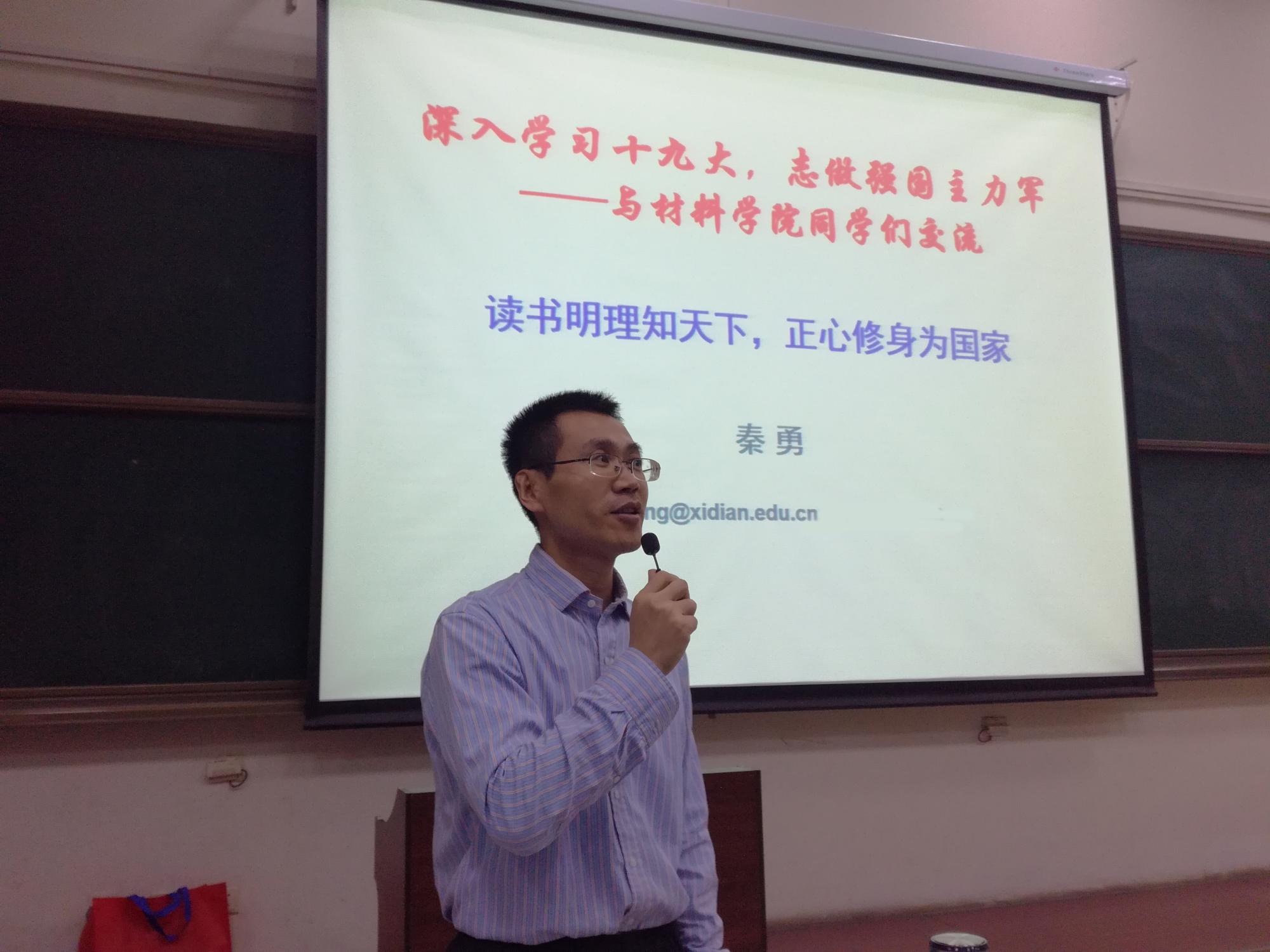 “众所周知,最近国家和世界的一件大事便是十九大的召开。这次会议将深刻影响未来五年、乃至三十几年的中国和世界。面对新的时代、新的征程、新的使命、新的思想,我们西电人该如何做?西电材料人该如何做?十九大会议中重要的内容就是十九大报告,我长期是从事科学研究的,今天抛砖引玉,从一个科研工作者的角度与大家一起探讨学习十九大报告。”