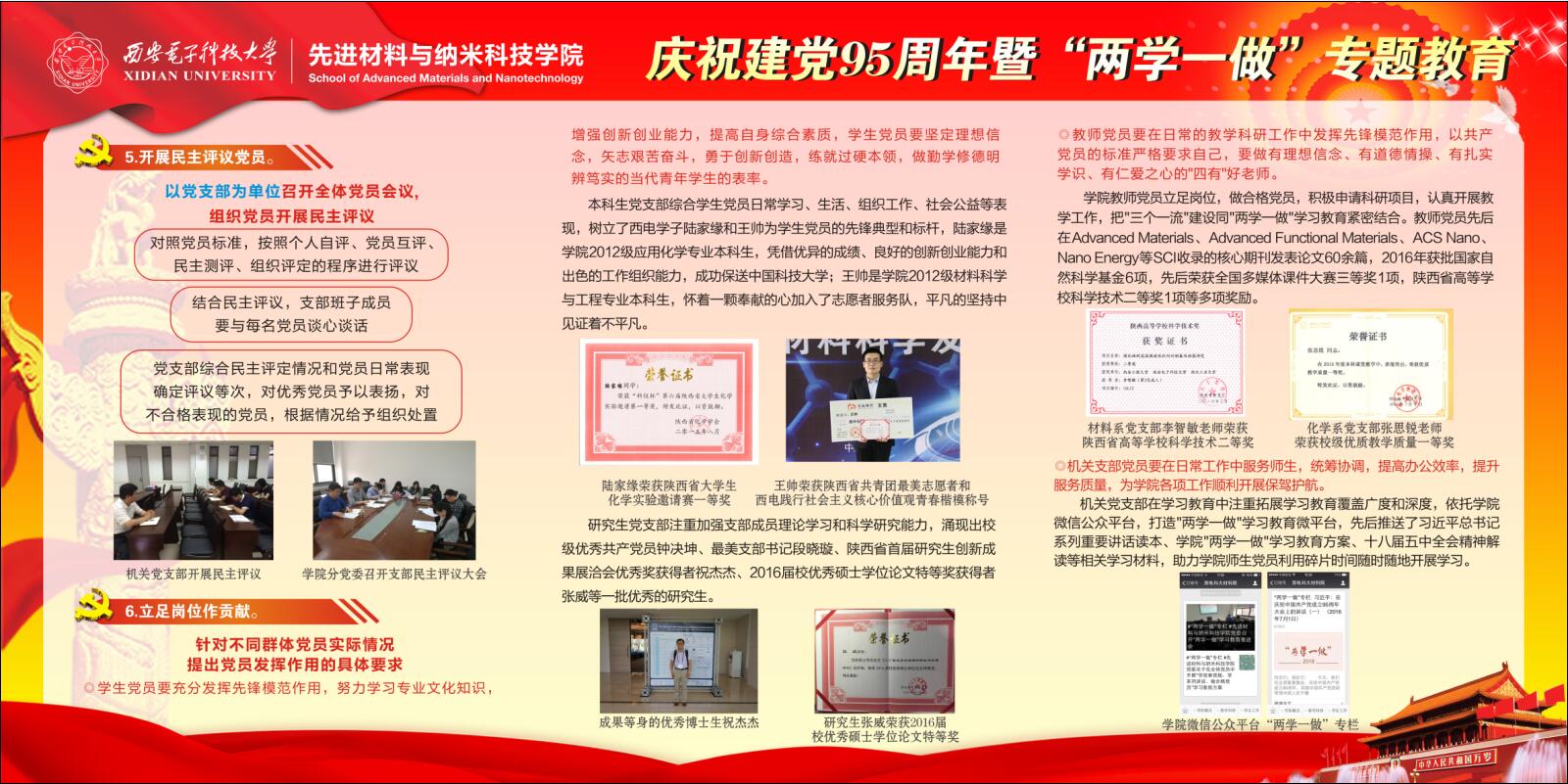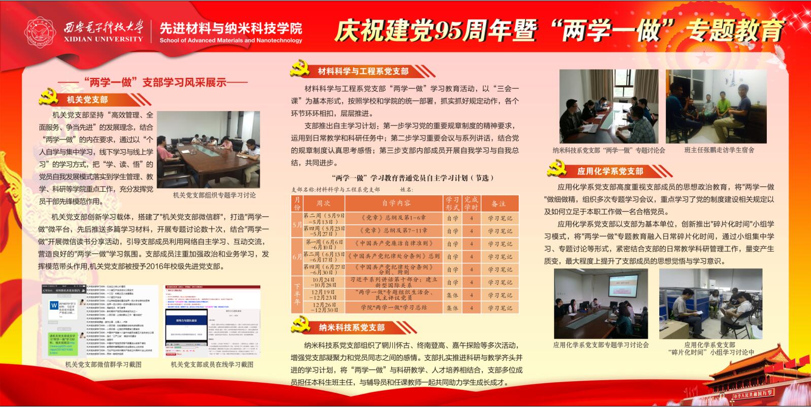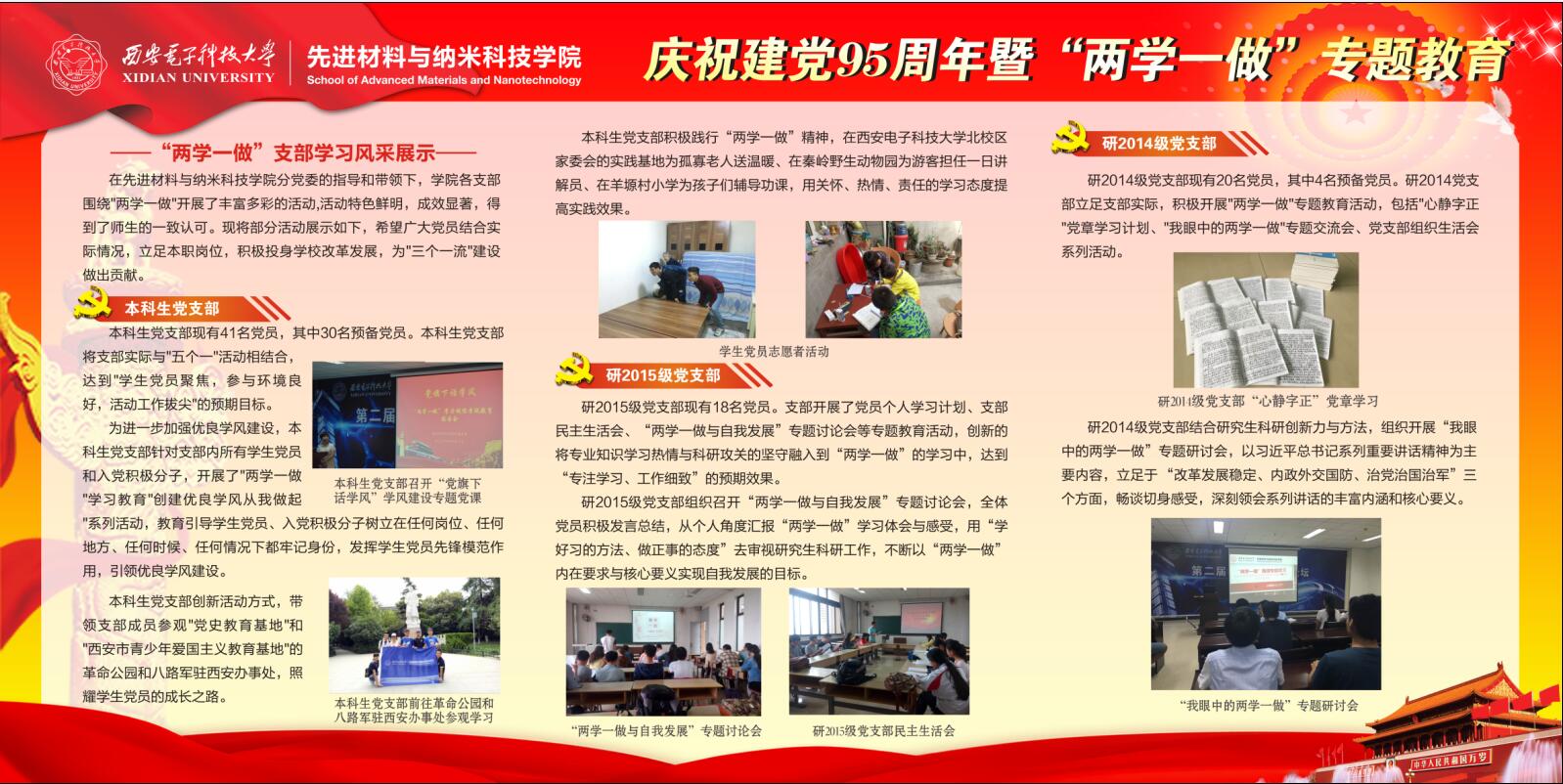 (通讯员 钟决坤 卢琳)为落实“两学一做”学习教育精神,充分发挥党员先锋模范作用,浓郁学院学习氛围,2016年9月,51吃瓜 在G楼一层大厅学院文化展示区推出庆祝建党95周年暨“两学一做”教育专题展示。 51吃瓜 积极开展“学党章党规、学系列讲话,做合格党员”学习教育活动,在学院分党委的指导和带领下,各支部以“两学一做”为中心开展了丰富多彩的学习教育活动,特色鲜明,成效显著。本次展示主要以展板的形式体现,紧紧围绕“两学一做”的核心教育内容、学院学习教育方案、各支部创意活动等内容,采用文字、图片和图表相结合的方式,全面、凝练且清晰的展示了“如何学、怎么做”,学院特色教育活动以及各支部将“两学一做”融入学习、教学、科研、管理等方面的风采。希望广大党员结合实际情况,立足本职岗位,积极投身学校改革发展,为“三个一流”建设做出贡献。(完)