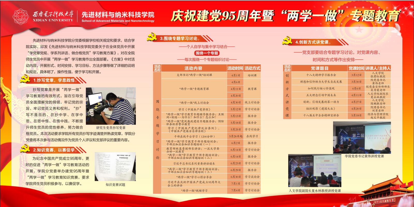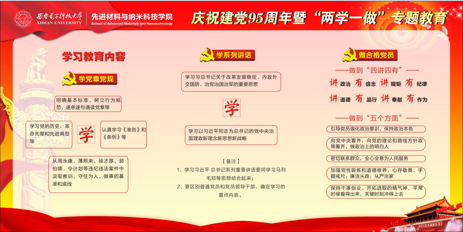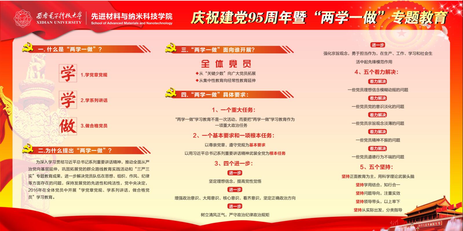 (通讯员 钟决坤 卢琳)为落实“两学一做”学习教育精神,充分发挥党员先锋模范作用,浓郁学院学习氛围,2016年9月,51吃瓜 在G楼一层大厅学院文化展示区推出庆祝建党95周年暨“两学一做”教育专题展示。 51吃瓜 积极开展“学党章党规、学系列讲话,做合格党员”学习教育活动,在学院分党委的指导和带领下,各支部以“两学一做”为中心开展了丰富多彩的学习教育活动,特色鲜明,成效显著。本次展示主要以展板的形式体现,紧紧围绕“两学一做”的核心教育内容、学院学习教育方案、各支部创意活动等内容,采用文字、图片和图表相结合的方式,全面、凝练且清晰的展示了“如何学、怎么做”,学院特色教育活动以及各支部将“两学一做”融入学习、教学、科研、管理等方面的风采。希望广大党员结合实际情况,立足本职岗位,积极投身学校改革发展,为“三个一流”建设做出贡献。(完)