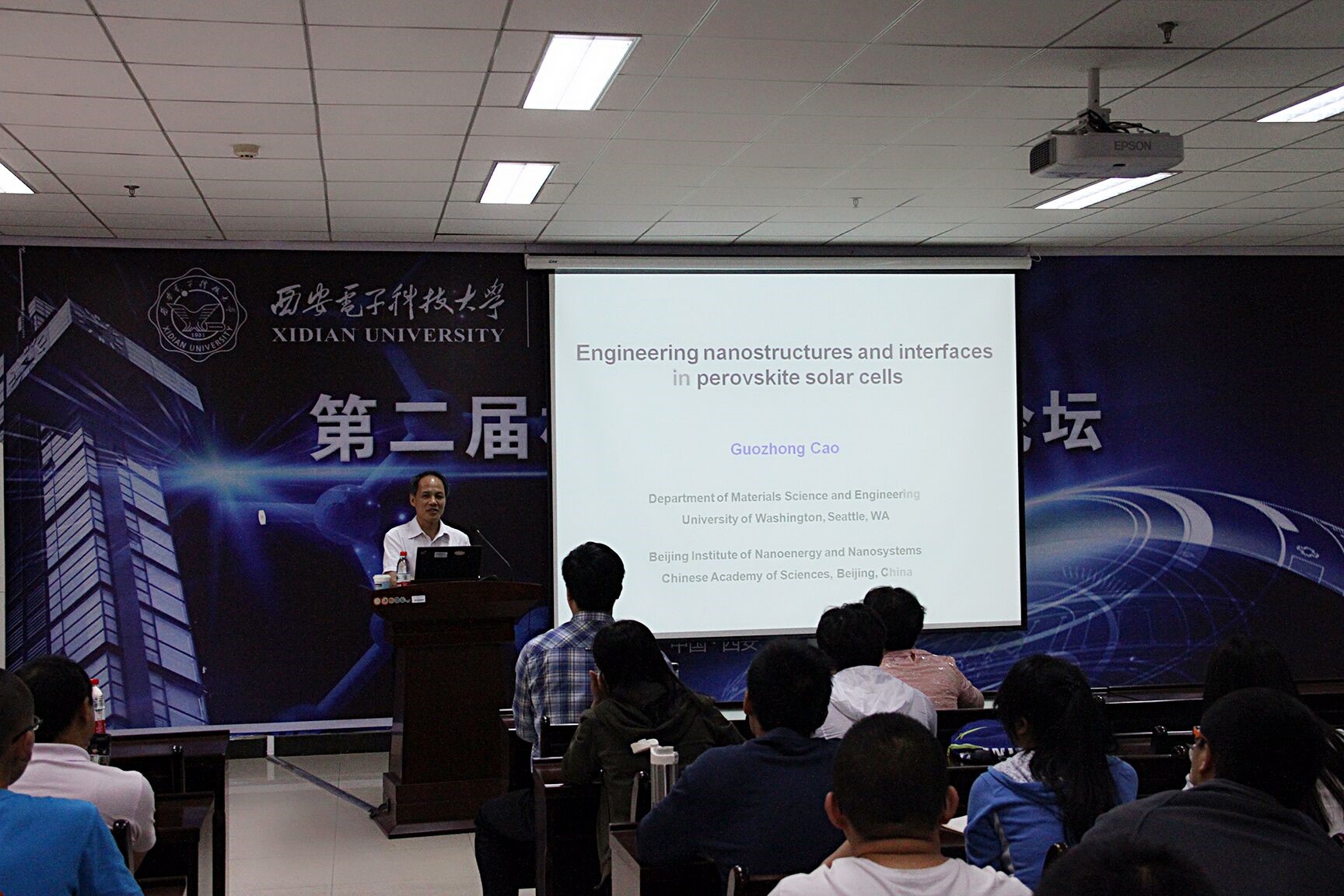 曹国忠教授介绍了其课题组在钙钛矿太阳能电池方面的研究工作,重点从纳米结构,以及表面改性对钙钛矿太阳能电池性能的影响,以及如何通过控制薄膜的厚度和粗糙度来改善钙钛矿太阳能电池的性能等方面进行了详细介绍。他提出,钙钛矿太阳能电池目前仍存在的问题,并同与会师生分享了如何在该领域开展科学探索的宝贵经验。
