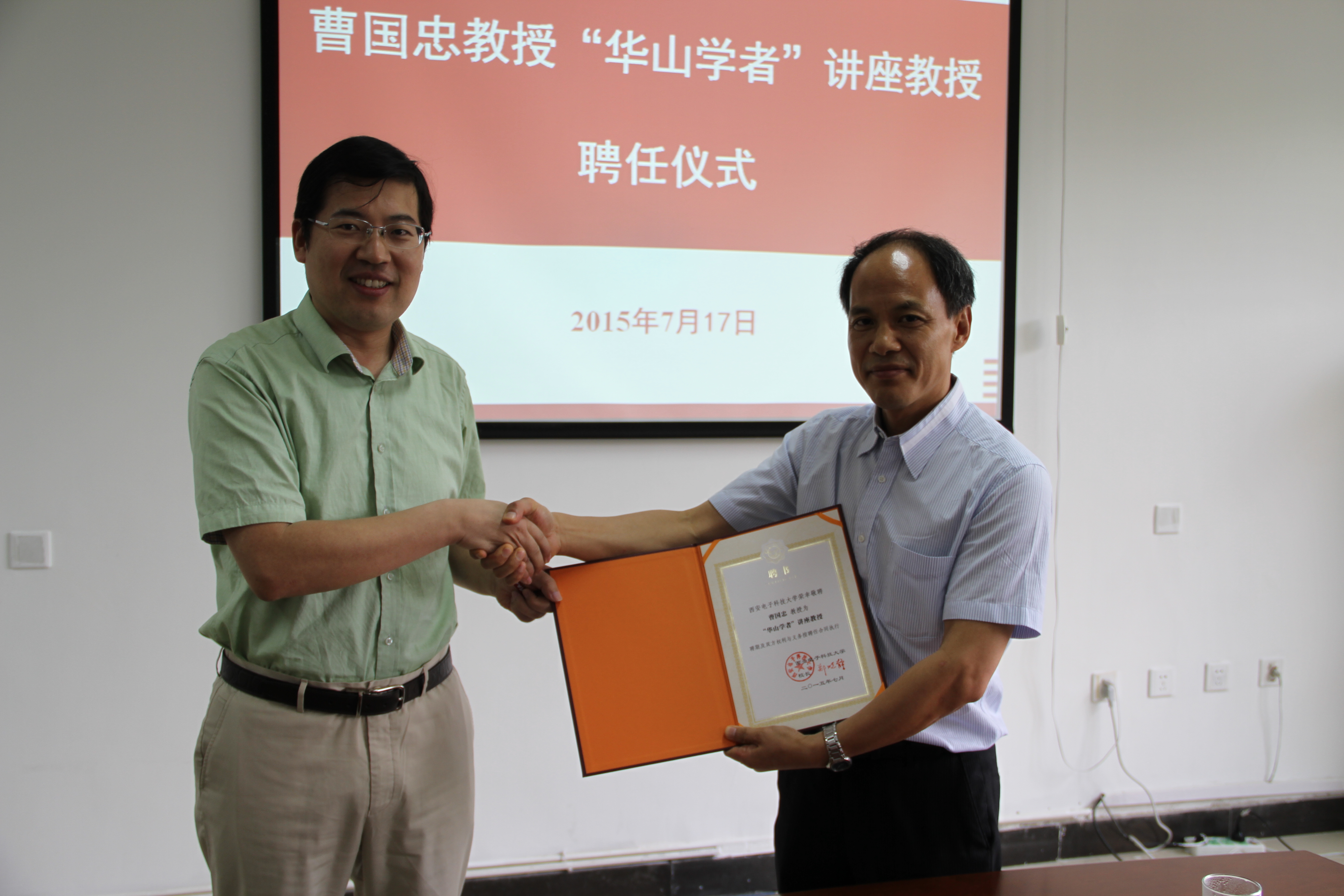 会议室进行,曹国忠正式受聘担任学校“华山学者”讲座教授。校长助理高新波出席聘任仪式并为曹国忠颁发聘任证书。