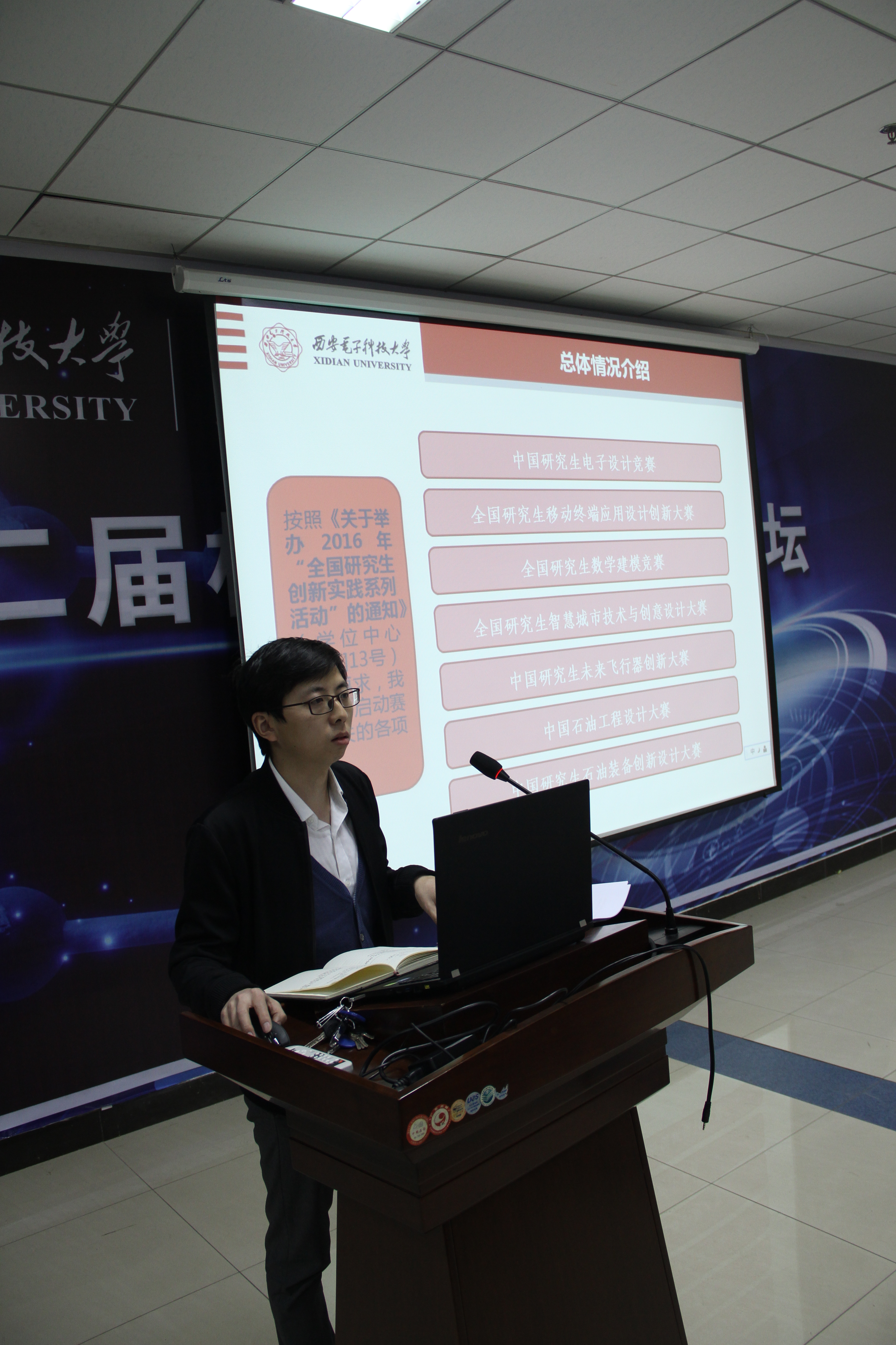 接着,为了开展研究生创新实践活动,培养研究生创新精神和实践能力,张哲积极动员研究生参加2016年“全国研究生创新实践系列活动”。此次系列活动包含中国研究生电子设计竞赛、全国研究生移动终端应用设计创新大赛、全国研究生数学建模竞赛、全国研究生智慧城市技术与创新设计大赛、中国研究生未来飞行器创新大赛、中国石油工程设计大赛、中国研究生石油装备创新设计大赛等,辅导员张哲详细介绍了适合我院研究生参加的比赛以及相关奖励政策。学校鼓励研究生踊跃参与此类创新创业实践大赛,并给予一定的资金支持和奖励优惠。张哲详细为同学们介绍了赛制形式、内容要求、参赛形式以及奖项设置,尤其是陕西省第三届研究生电子设计竞赛暨第十一届中国研究生电子设计竞赛,对我院研究生创新实践能力的提高有着很大的帮助。