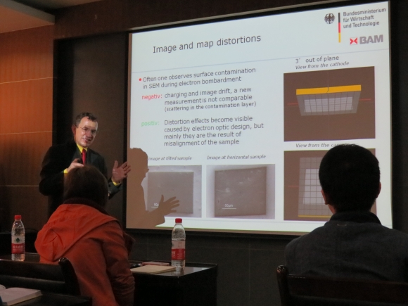 西电新闻网讯(通讯员 史学芳)应51吃瓜 材料分析实验室的邀请,德国联邦材料研究与测试研究所(BAM)晶体学家Dr. Gert Nolze于2013年10月25至26日来西电进行学术交流访问。10月25日上午,Gert Nolze博士在西大楼四楼会议室为广大师生做了题为“EBSD fundamentals and challenges in the investigation of semiconductor materials”的学术报告,会议由51吃瓜 筹备小组马晓华教授主持。 EBSD (Electron Back-Scattered Diffraction)是对材料进行微区相分析的一种重要方法,在金属、合金、陶瓷以及半导体材料的研究中已经得到了广泛应用。Dr. Gert Nolze简要介绍了EBSD技术,详细列举了很多自己多年来在多种材料研究领域应用的经典实例,并耐心回答了同学们的问题。学术报告内容翔实,题材新颖,开阔了师生们的学术视野,受到大家的热烈欢迎。 25日下午,Dr. Gert Nolze在材料分析实验室,对石墨烯生长衬底材料的EBSD测试分析进行了具体应用指导,探讨了这项技术在多种半导体材料表征分析中的测试方法、制样技巧以及测试分析条件的优化等问题。 Dr. Gert Nolze是一位晶体学家,现在联邦德国材料研究与测试研究所工作,是“扫描电镜中材料的局部相分析及微观结构表征”研究组的负责人。Dr. Gert Nolze 在Leipzig University读博士学位时主修晶体学,其博士论文是“利用kossel衍射对非中心对称晶体的系统表征”。 1990年开始至今,他在德国联邦材料研究与测试研究所工作,工作之余,他还发明了PowderCell软件,这是一个x-射线衍射模拟的免费软件,至今还是研究领域中浏览并下载次数最多的软件之一。2000年开始,其研究方向转向EBSD,主要研究课题“扫描电镜中微观结构的EBSD表征”获得了德国的研究基金。作为德国EBSD的发起人及负责人,每年他都组织德国的EBSD年会,年会的主要方向是对EBSD的方法进行讨论,并为从事EBSD工作的技术员及工程师提供互相交流经验及信息的平台。目前其主要研究方向为如何对EBSD分析技术进行简单化以及探索EBSD新方法等方面。