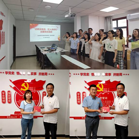 随后,党支部书记程远向邓悦、崔康两位同志赠送了政治生日贺卡和礼物。两位党员同志满怀激动,与在座党员分享交流了入党初心和感受。邓悦说到:“虽然角色不断转换,但作为教育系统的一员,我始终保持立德树人的初心,在此我也向党保证,我会以实际行动践行入党誓言,继续保持严谨的工作态度,不断为党的事业添砖加瓦。”崔康谈到:“作为一名辅导员,我在开展学生工作过程中深有体会,为党育人、为国育才就是我的初心和使命,我会牢记责任在肩,踏实工作,做好学生成长成才的领路人。”程远向两位同志表示了祝贺,他指出,希望同志们在以后的工作生活中,更加牢记责任、使命和担当,坚守党员身份,用自己的所学、所言和所行去践行一个共产党员的操守和信仰,切实发挥党员的模范作用,立足工作岗位做表率,为学校红色育人事业再立新功。最后,在程远的带领下,支部全体党员重温入党誓词。