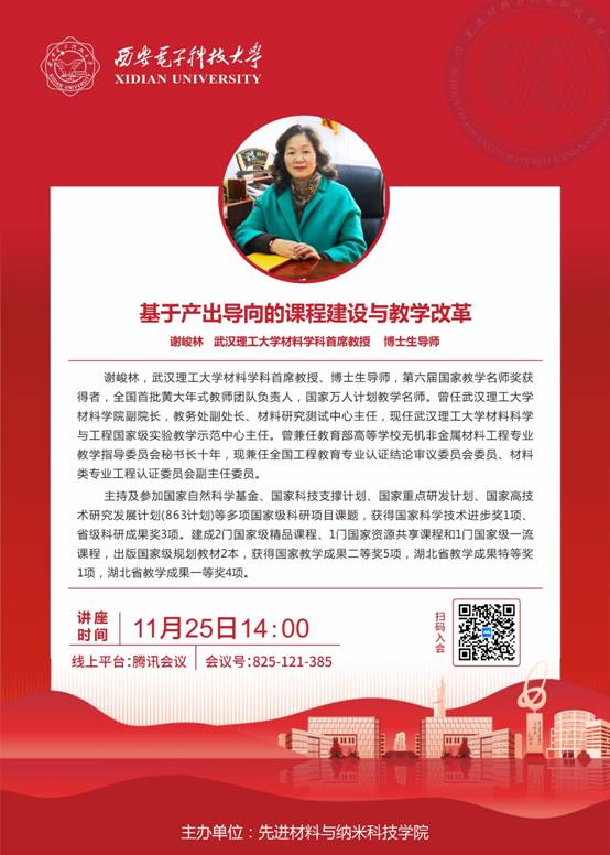 11月25日下午,武汉理工大学材料科学与工程国家级实验教学示范中心主任谢峻林教授受邀为我院作报告,报告主题是“基于产出导向的课程建设与教学改革”。本次报告采用“线上”方式进行,学院教师及其他学院教师代表共80余人参加了报告会。报告会由学院副院长杨如森主持。