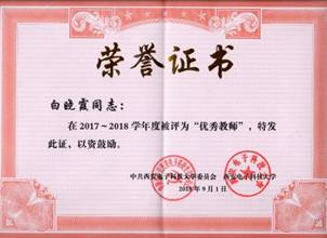 作为一名高校党员教师,白晓霞老师始终牢记党员第一身份、教书第一职责,坚定拥护党的领导,积极参加党组织活动、完成党组织任务,以思想认识的加强提升牵引业务水平的拓展提高。白老师作为本科生班主任,重视班风、学风的培养,深入了解每个学生的思想动态,令其充分认识到大学期间知识获取的紧迫性、本专业的重要性以及与其他专业的紧密相关性,帮助做好大学四年本科生生涯规划。2019年和2020年,所带班级多名本科生荣获国家级奖励,包括国家奖学金、全国大学生化工设计大赛二等奖、数维杯大学生数模竞赛二等奖和美国大学生数模竞赛三等奖等。白老师作为硕士生导师,时刻利用自己所学和科研热情鼓励学生做好研究生阶段的工作,帮助学生树立以兴趣为导向、快乐科研的根本意识,掌握科研工作的基本方法,建立缜密的思维方式,挖掘创新的潜在能力等。白晓霞老师始终坚守“三全育人”和“四有”好教师宗旨,尽自己最大努力培养综合素质高和专业能力强的储备人才。