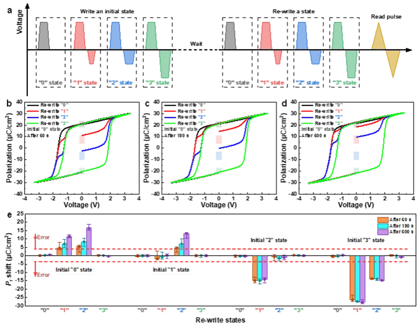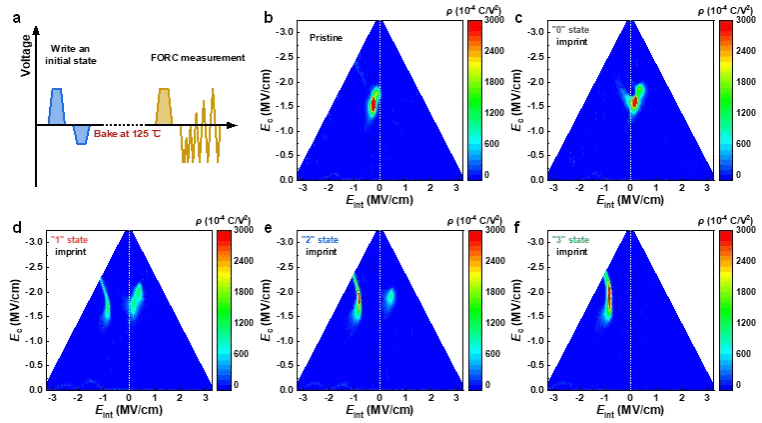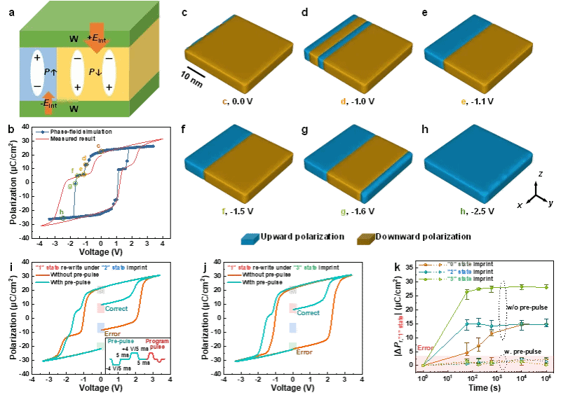 经相场模拟验证的多值铁电HfO2印记失效模型;以及实现室温长期稳定写入的预编程方法。