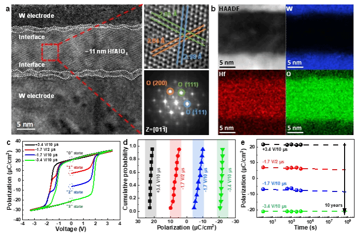 团队设计制备的能长时间保存数据、实现2-bit/cell多值存储HfAlOx电容。