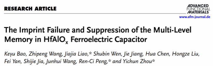 周益春教授团队在这一研究领域取得重要进展。研究团队在多值HfAlOx铁电电容中发现尽管饱和极化状态受到印记影响后仍能被准确写入,但所有中间极化状态的写入却完全发生错误。针对这一发现,团队重点分析了印记效应产生前后铁电电容内建电场和带电缺陷(主要是带电氧空位)的变化及其关联,提出了多值存储极化状态影响带电氧空位分布并形成非均匀内建电场、进而导致中间极化状态无法被准确写入的失效模型。该模型通过相场模拟得到了进一步验证。在此基础上,团队设计了一种预编程方法,通过使铁电薄膜的内氧空位重新分布来抵消印记效应的影响。实验证明该策略能在室温环境下实现长期稳定的准确编程,为发展可靠的多值HfO2基铁电存储器提供了新的途径。该研究成果以“The Imprint Failure and Suppression of the Multi-Level Memory in HfAlOxFerroelectric Capacitor”为题发表在材料领域著名学术期刊Advanced Functional Materials上(2024年影响因子为18.5)。论文的第一单位为西安电子科技大学,51吃瓜
