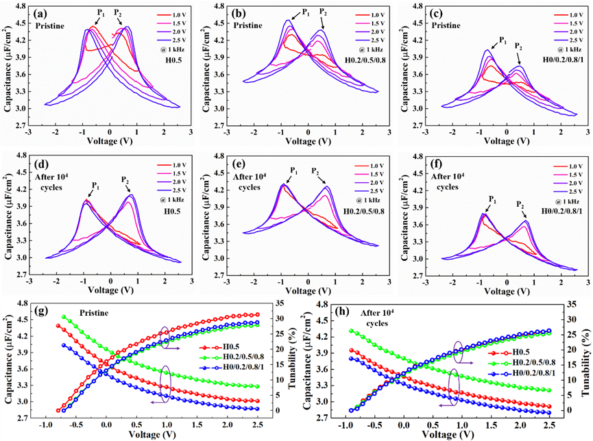 进一步地,对制备的不同Hf/Zr元素分布的Hf0.5Zr0.5O2薄膜电容器的电容-电压曲线进行了测试分析,如图5(a)-(f)所示。在唤醒前后,电容-电压曲线均呈现出典型的“蝶形”形状,表明制备的薄膜材料具有优异的铁电性能,这与测得的电滞回线结果一致。在唤醒之后,发现薄膜电容器的电容值有所降低,这可归因于高介电常数值的四方相在电场循环过程中转变为介电常数相对较低的铁电正交相,相应的电滞回线也变的更加饱满。鉴于高介电调谐率和低驱动电压的铁电材料有望推动移相器、滤波器以及可调电容器等可调谐器件的小型化和集成化发展,进一步基于测得的电容-电压曲线计算得到相应的介电调谐特性,如图5(g)-(g)所示。在2.5 V工作电压下,其介电调谐率可以达到26%以上。
