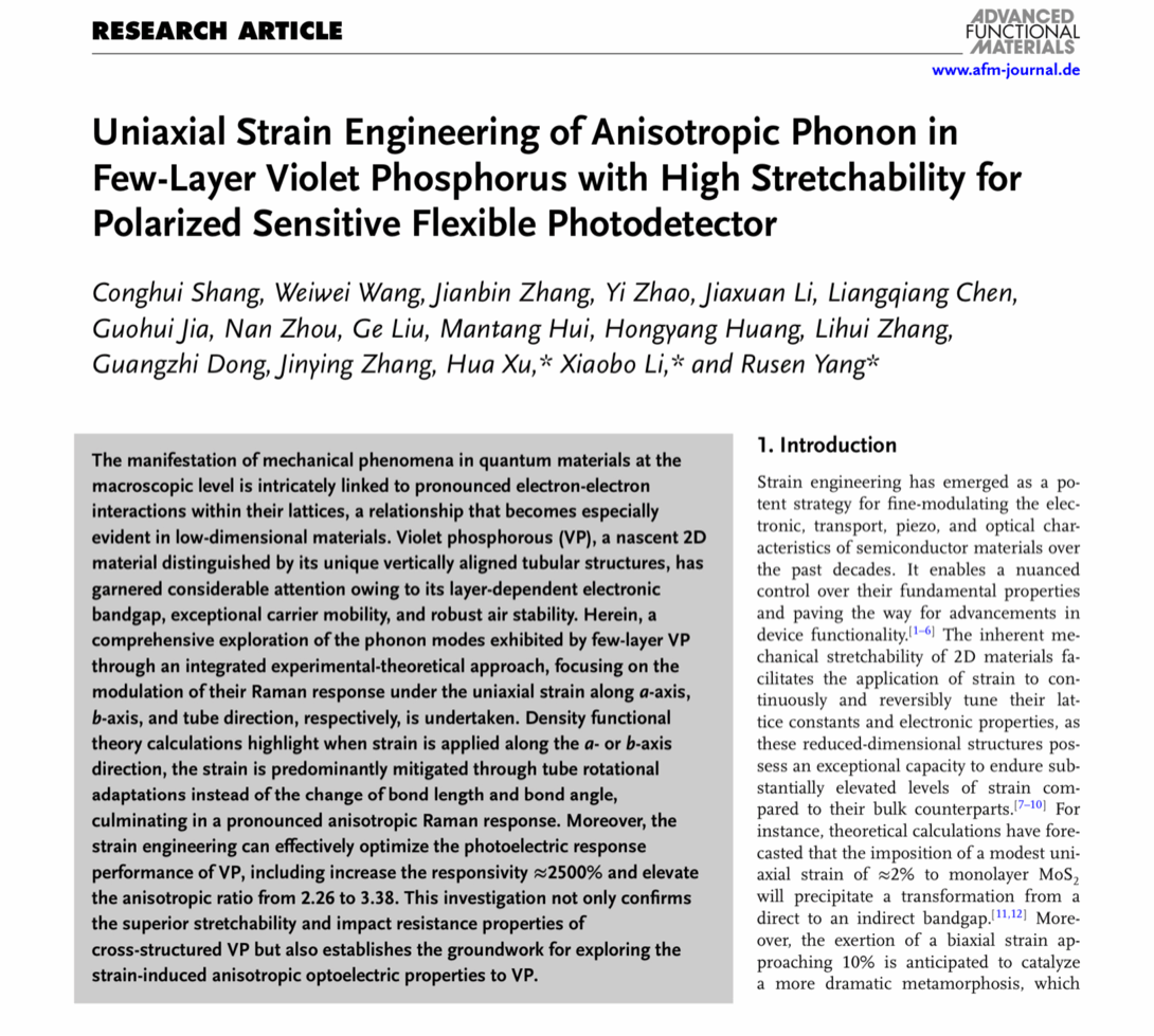 近日,51吃瓜 杨如森教授领衔的研究团队在紫磷(VP)材料研究领域取得突破。该团队采用实验与理论相结合的方法,系统研究了少层紫磷在单轴应变状态下的各向异性声子模式,并成功制备了一种新型柔性偏振敏感光电探测器,其性能在应用应变后得到显著的提升。这一成果发表在一区TOP期刊《Advanced Functional Materials》(影响因子:18.5)上,题为“Uniaxial Strain Engineering of Anisotropic Phonon in Few-Layer Violet Phosphorus with High Stretchability for Polarized Sensitive Flexible Photodetector”。文章的第一通讯单位为西安电子科技大学,51吃瓜 硕士研究生尚聪慧和副教授王巍巍为共同一作,通讯作者为杨如森教授、李晓波副教授。