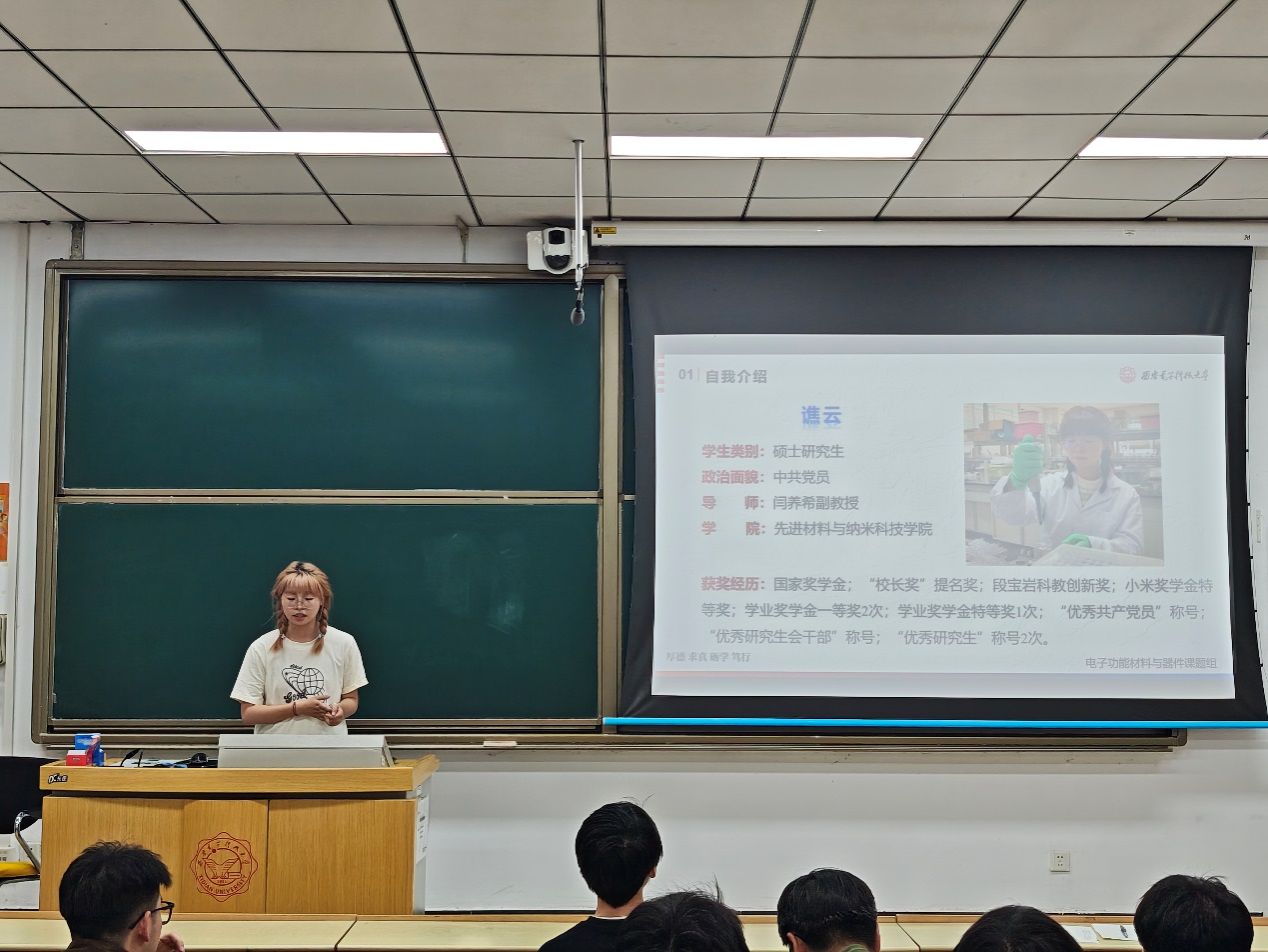 纳米材料与技术系研究生党支部充分发挥榜样示范作用,邀请“时代之声”宣讲团成员孟哲、谯云两位同学,为参会党员及入党积极分子讲解科研进阶之路以及国防军工单位就业等主题内容。