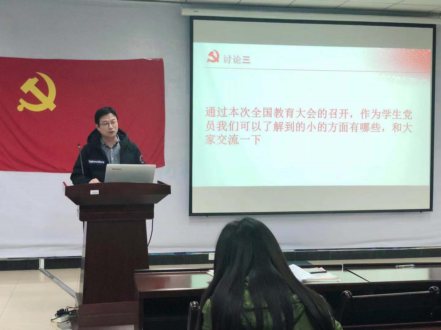 支部书记李鑫主持召开此次会议,宣读本次学习主题,第一党小组成员带领大家对本次会议精神进行学习解读,全体党员及积极分子共同学习了2018年《学习贯彻全国教育大会精神》。接着,宣传委员张兴茂对会议精神提出问题讨论,大家进行了热烈的讨论;组织委员简瑛瑛对全体党员进行党员基本知识测验,会场反应十分积极。最后,支部书记李鑫对预备党员及新加入的积极分子进行了党员发展及教育培养流程的学习。讲述了基层党支部的条例、规范及党员职责与使命。