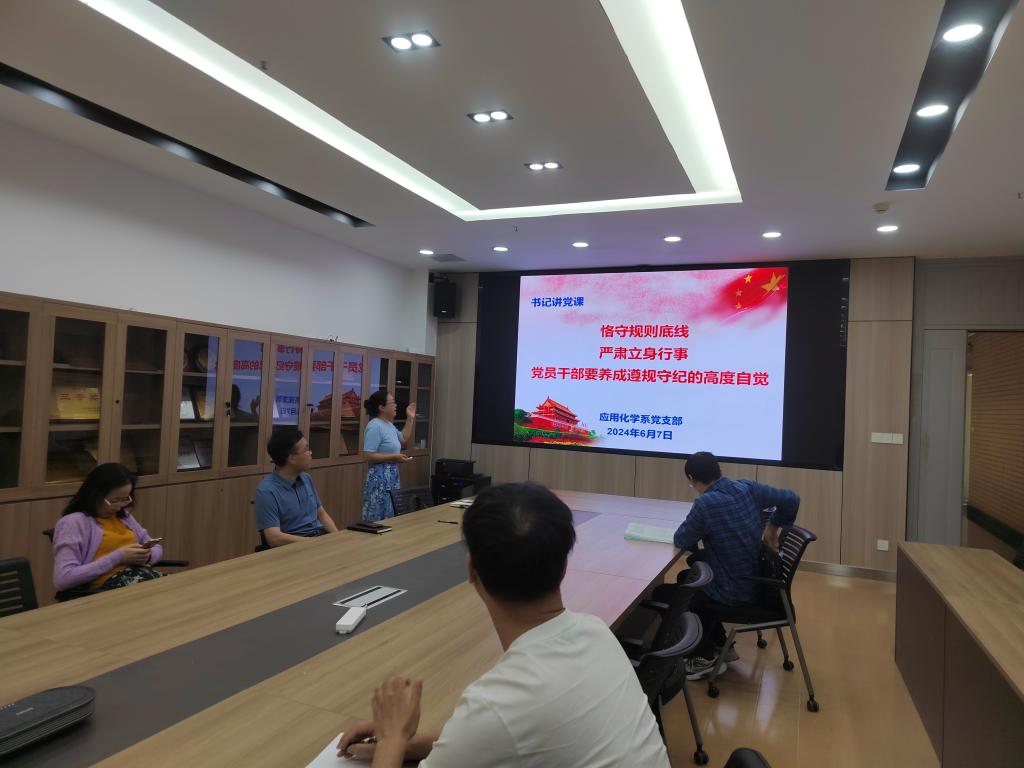 应用化学系党支部开展党纪学习教育,党支部书记周利君以“恪守规则底线 严肃立身行事 党员干部要养成遵规守纪的高度自觉”为主题讲授党课。学院党委书记宋刚锋、执行院长杨丽和支部党员参加活动。