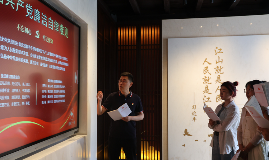 在纪念馆内,学院党委副书记陈刚以“推进党纪学习教育”为主题,为师生们讲授了一堂生动的党课。陈刚从纪律处分种类、措施与规则,带领师生学习了“六大纪律”主要违纪行为,集体学习了新修订的《中国共产党纪律处分条例》,教育引导党员干部要增强纪律意识、加强自我约束。