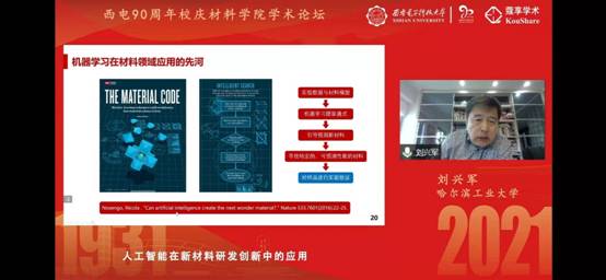 刘兴军教授首先对西电90周年校庆表示祝贺,紧接着他结合机器学习在材料科学领域中的应用为大家带来本期论坛的第一场报告《人工智能在新材料研发创新中的应用》。刘教授以新型钴基高温合金为例进行建立模型的分析,指出机器学习适用于解决传统数据分析及材料计算方法无法有效解决的难题,并分析了未来机器学习算法在其他新材料研发中的可行性,在座的师生表示受益匪浅。
