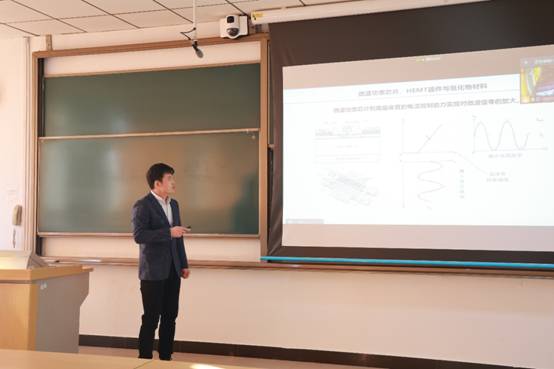 第二场报告《氮化物半导体的分子束外延生长及其微波功率器件应用》由我院青年教师杨眉带来,他从氮化物半导体的背景和独有优势开始,重点讲述了氮化物异质结的分子束外延生长工作在提升氮化物微波功率器件的效率、拓宽频率和功率应用范围中的重要突破,最后对氮化物在其他领域的潜在应用进行了展望。