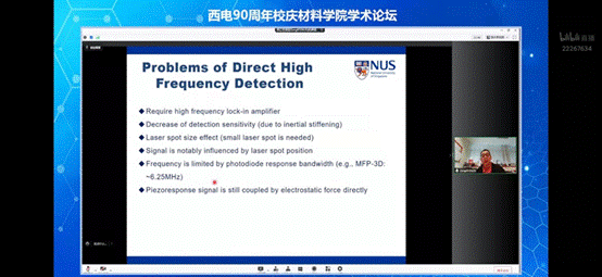 曾开阳副教授的报告题目为《Nanoscale Ferroelectric Characterization with Advanced Multi-Frequency Scanning Probe Microscopies》,他提到传统的压电力显微镜(PFM)常常会因为诸多技术上的局限性而引发一系列操作上和测量结果上的问题和假象,这使得PFM目前在测量的有效性、准确性以及可重复性上面临着巨大挑战。曾教授重点介绍了其团队在基于兆赫兹高频激励和外差检测的外差兆频超声压电力显微镜(Heterodyne MegasonicPiezoresponse Force Microscopy, HM-PFM)和非接触式外差电致应变力显微镜(Non-Contact Heterodyne Electrostrain Force Microscopy, NC-HEsFM)中的研究成果,最后他对原子级分辨的压电应变表征进行了展望。报告结束后,我院青年教师王咏梅就金属有机骨架材料的压电效应表征技术与曾开阳深入交流和讨论。