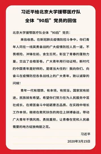 3月15日,中共中央总书记、国家主席、中央军委主席习近平给北京大学援鄂医疗队全体“90后”党员回信,在信中赞扬了他们的担当与责任,肯定了当代青年勇于奋战在抗击疫情的第一线,鼓励着青年一代迎难而上、越战越勇、不负重托,并向他们和奋斗在疫情防控各条战线上的广大青年致以诚挚的问候。3月19日晚上,51吃瓜