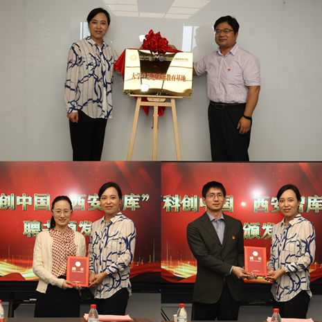 随后,张婷婷为学院专家代表国家级领军人才、青科特别奖获得者杨丽教授和国家级青年人才廖敏教授发放“科创中国 西安智库”专家聘书,并与学院党委书记卢硕共同为“大学生思想政治教育基地”揭牌。