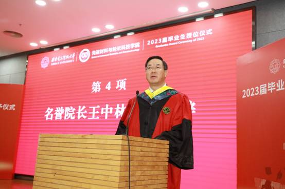 中国科学院外籍院士、学院名誉院长、爱因斯坦世界科学奖得主、能源界最高奖——埃尼奖得主王中林教授在致辞中表示,毕业是踏上新征程的开始,在西电所受的教育是对个人学识、人格和性格的历练,他结合自身心路历程告诉同学们,自信的前提是拥有扎实的知识基础和丰富的经历,这是广大学子未来的取胜法宝。人生不同阶段有不同的挑战与任务,关于如何走好人生新征程,王中林院士结合自身追求卓越,勇攀纳米能源领域高峰的人生经历和宝贵经验送给学生四点建议:首先,“心怀志向,脚踏实地”方才能步步为营,达到想达到的高度;其次“学会谦虚,与同事处理好关系”是踏入社会应当学习的第一课;再者,拥有“实干精神”才能有所建树;最后,“注重科学原理创新”才能将“0”变成“1”。他强调,西电虽然作为工科学校,但不可忽视理科基本原理的学习,研究透本质才能产生真正意义上的创新,才能取得更多开创性的研究发现。最后他指出,良好的体魄对于个人发展至关重要,能够帮助个人直面时代的机遇与挑战,实现个人的价值和梦想,希望各位毕业生不忘师恩,努力为学校、为国家发展做出自己的贡献,成为西电的骄傲。