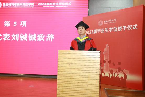 陕西省高层次青年人才谭丹副教授作为教师代表发言,她动情地说到:“文凭不等于水平,学历不等于能力,学以致用,才能在社会这所大学中获得认可。”她鼓励毕业生以开放的胸襟和积极的进取心拥抱新的挑战,不断学习,不断修炼,到达人生新高度。“积岁月之沉淀,谱未来之新篇”硕士毕业生代表刘心怡回顾了在西电的三年求学时光,她表示:无论走多远,“厚德、求真、励学、笃行”校训都永远深烙西电学子心中。本科生代表张殊诚分享了自己四年来的成长历程,抒发了自己毕业喜悦的心情,对于西电,他难掩留恋,他表示即便未来充满选择,前进之路荆棘丛生,但希望西电青年可以保持热爱,拥有一颗勇敢向前的心,归来仍是少年。