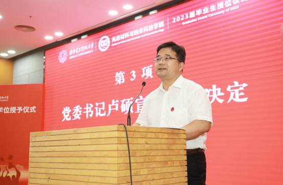 二是脚踏实地,矢志奋斗,方能鱼跃龙门成栋梁。曾经的你们,本就已是高考或考研大军中的佼佼者。今天的你们,更是领略了满腹经纶的智慧,展现了经世致用的才干,具备了艰苦奋进的意志,所以,我从不怀疑你们的实力,只期待你们脚踏实地,矢志奋斗,在电子材料的时代龙门上早日成为国家栋梁。我们的优秀校友、名誉院长王中林院士,即是你们奋进的榜样,也是你们前进的守护。因为这份守护,今天他特别来到这里,为你们见证和祝福。今天的你们,已有第七届全国“互联网+”金奖的张殊诚、国际数模竞赛特等奖提名的邱嘉俊和黄子凡,在先进能源材料领域顶刊AEM发表论文的叶涛、“毕业之星”武新明、优秀硕士论文叶涛、张建斌等。未来的你们,就如同初升的骄阳,会更辉煌。