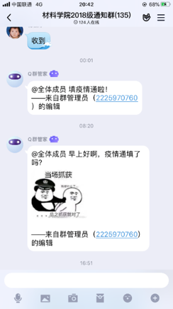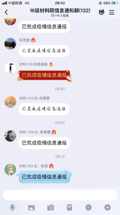 学院严格执行学校“疫情通”每日填报制度,密切跟踪关注居住地变动及可能有相关疑似症状的学生情况,填报率率先达到并始终保持100%。同时,学院辅导员通过QQ群、微信群、钉钉等及时向学生转达发布学校相关教学、教育、管理等通知,通过班级心理委员和班级群,对学生进行思想引导和人文关怀,舒缓学生心理压力,鼓励学生以积极向上的心态投入到线上学习中,通过哔哩哔哩、腾讯会议等开启“云点名”,开启线上思政新模式。