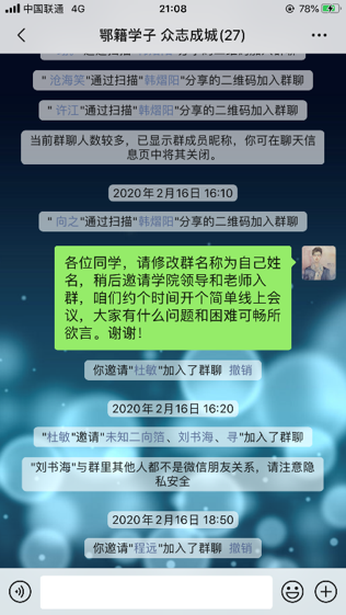 另外,学院高度关心湖北籍学生生活、学习情况,建立在鄂学子微信群,及时了解学生近况,解决学生实际困难。